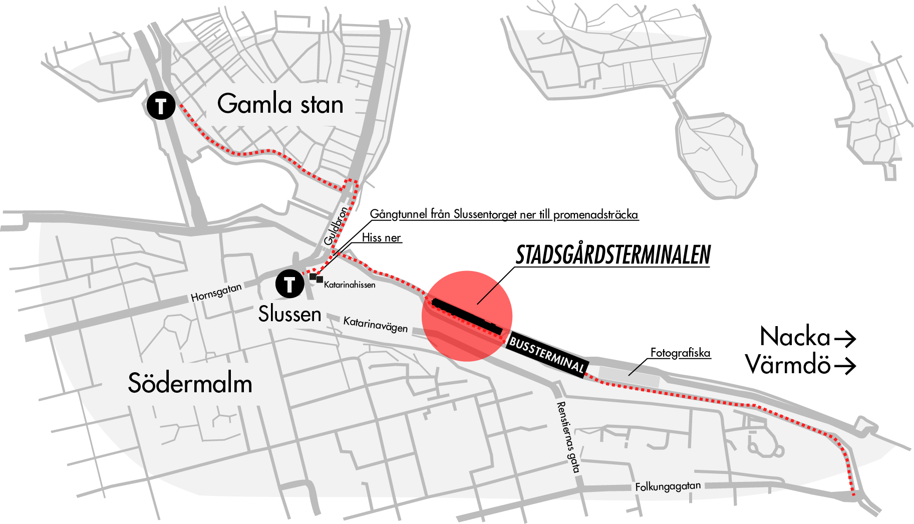 På torget korsar du sedan övergångsstället och tar trapporna till vänster där skyltar pekar mot Nacka och Värmdö-bussarna, Stadsgårdskajen och Fotografiska. Efter trapporna tar du till höger och följer sedan gången längs med vattnet vilken leder dig fram till Stadsgårdsterminalen.